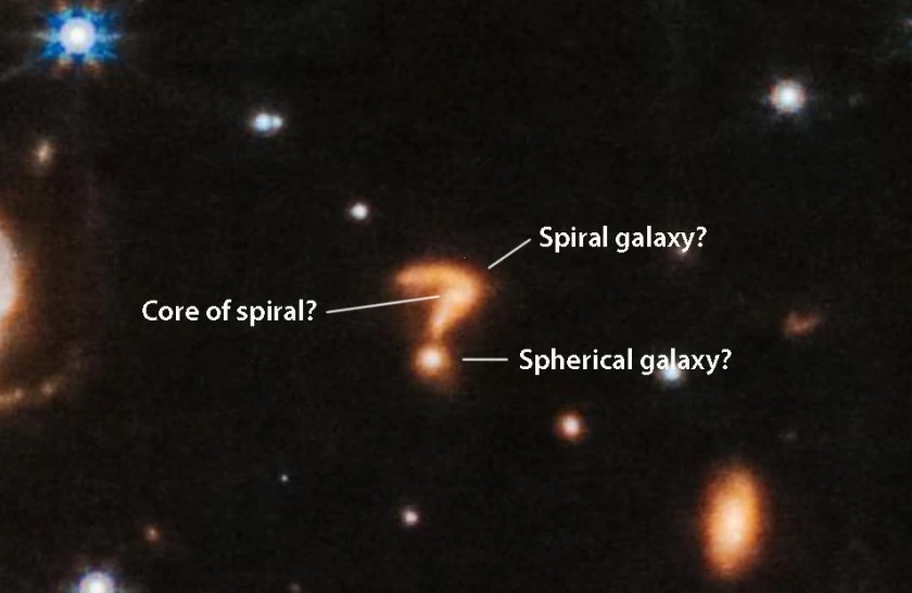 곡선의 두 개의 밝은 점과 물음표의 점은 은하의 중심일 수 있으며 곡선 자체는 중력에 의해 벗겨진 가스와 별의 꼬리일 수 있습니다. 그 물체는 우리에게서 아주 멀리, 아마도 수십억 광년 떨어져 있기 때문에 우리는 그것을 먼 과거의 모습으로 보고 있습니다.