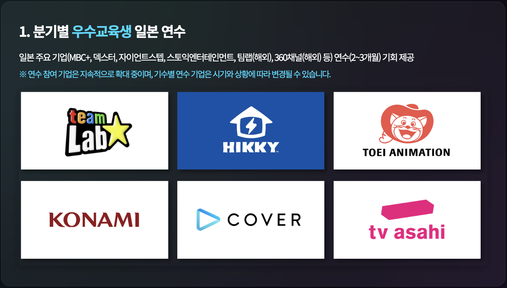 - 국내기업(MBC플러스, 아이코닉스, 메타K, 스튜디오게임, 스토익덱스터, 자이언트스텝 등) 인턴십 2개월 기회 제공